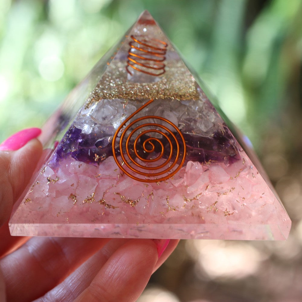 Amethyst Rose & Clear Quartz Orgone Pyramid XL 3in 75mm EMF & 5G Protection